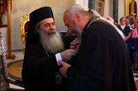 В ходе поездки Преосвященнный Стефан встречался с Патриархом Иерусалимским Феофилом III и преподнес ему памятные подарки.