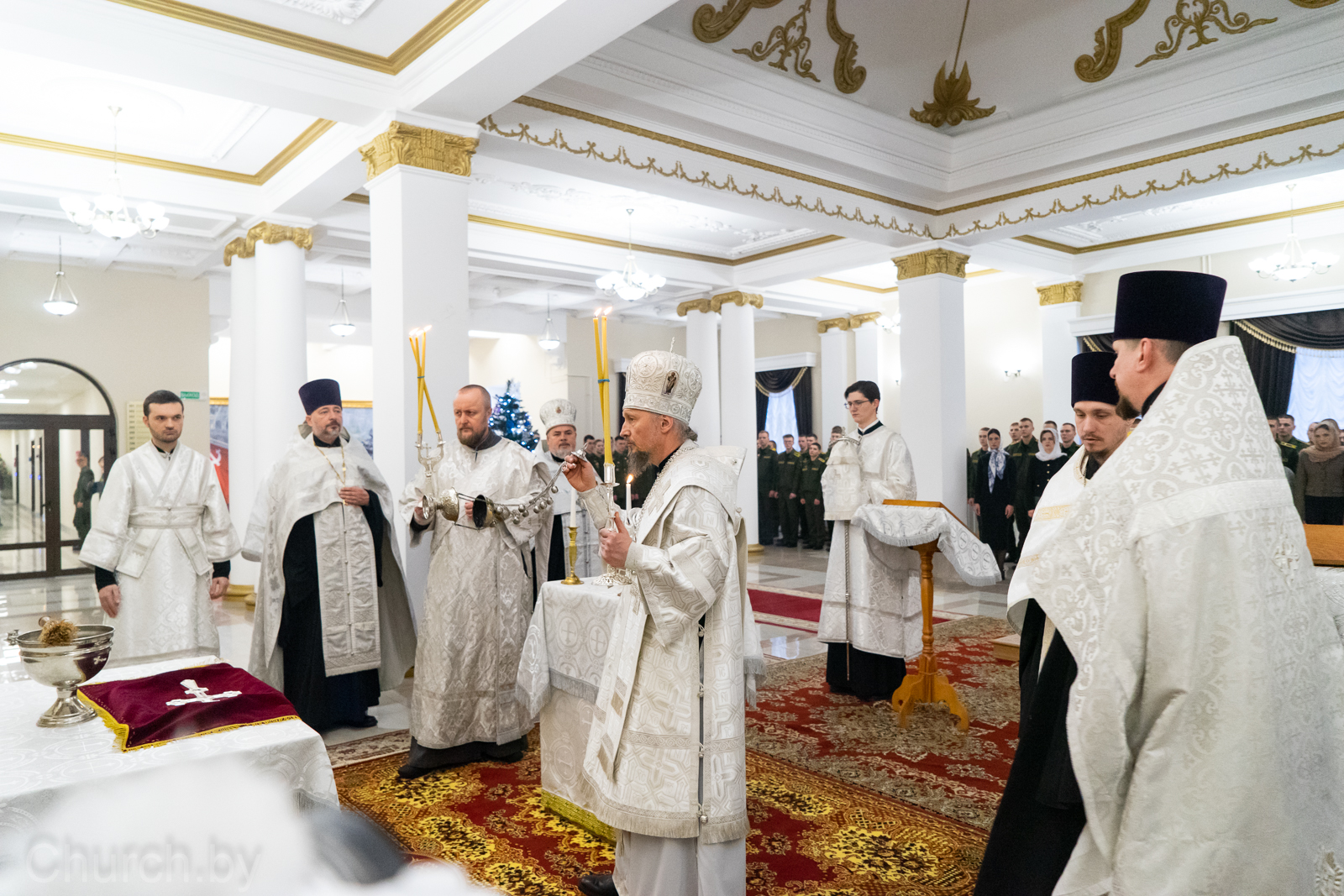 Его Высокопреосвященству сослужили: председатель Синодального отдела Белорусского Экзархата по взаимодействию с Вооруженными Силами и другими воинскими формированиями Республики Беларусь, настоятель прихода храма Рождества Пресвятой Богородицы деревни Тарасово Минского района протоиерей Сергий Кузьменков; заместитель председателя, руководитель отдела Минской епархии по взаимодействию с Вооруженными Силами иерей Иоанн Ковалев; заместитель председателя Синодального отдела иерей Вадим Шпаков; настоятель прихода храма Благовещения Пресвятой Богородицы в деревне Копище Минского района иерей Дионисий Ковалев.