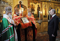 7 мая 2012 года в Благовещенском соборе Московского Кремля Святейший Патриарх Московский и всея Руси Кирилл совершил молебное пение по случаю вступления в должность Президента Российской Федерации В.В. Путина Предстоятель Русской Православной Церкви встретил Президента России с супругой у входа в Благовещенский собор.