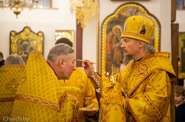 Его Высокопреосвященству сослужили: секретарь Минской епархии протоиерей Андрей Волков и клирики кафедрального собора.
